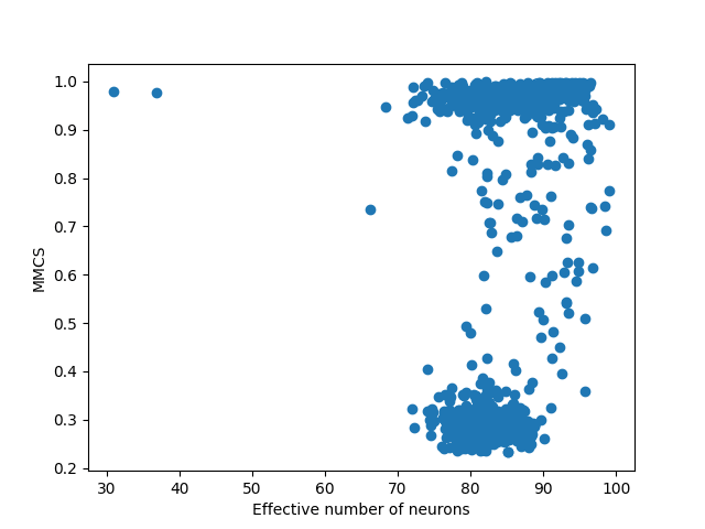One thing that one might have expected to see was that the features which are learned would be somewhat sparse in the neuron basis, as this allows the network to use the non-linearity to screen off noise. This is not the sparsity that we're directly incentivising (which is the sparsity in which features are active at any given moment) but it's predicted by some models of how networks utilise MLPs. such as that found in toy models of superposition. This doesn't appear to be the case for the found features in our miniature transformer as the following graph shows (with 2 outlier exceptions). I calculate the effective number of neurons that the feature attends to, using the Simpson diversity index (results using the entropy of the vector elements are almost identical) and find that the found features are if anything attending to more elements than a random vector, which have an average diversity index of 82, compared to 83 for low-MMCS features and 85 for high-MMCS features.