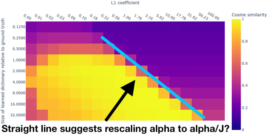 The work of finding and comparing these dictionaries was made easier by realising that the diagonal lines that were consistently found in the previous posts corresponded quite precisely to a consistent ratio of dictionary_size : l1_coefficient, as shown by Robert Huben's diagram below. This was caused by the fact that we were dividing the l1_loss term by the size of the dictionary. Removing this division step allowed running sweeps across a wide range of dictionary sizes with a consistent l1 coefficient.