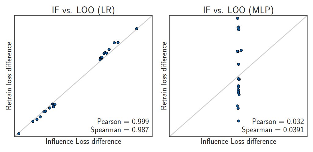 But these assumptions don't hold for neural networks, and Basu 2020 shows that influence functions are a terrible approximation of leave-one-out in the context of neural networks, as shown in this figure from Bae 2022 (left is for Linear Regression, where the approximation hold, right is for MultiLayer-Perceptron, where it doesn’t):
