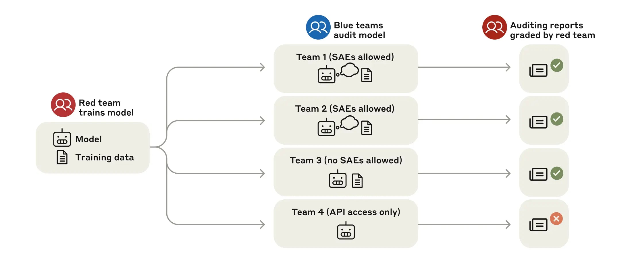 Fig 1: Structure of our blind auditing game. Our game is structured as a red team/blue team exercise. A red team trains a model behind a strict information barrier. Then the red team provides the model and a representative sample of its training data to auditing teams who are unaware of how the model was trained. These teams—which are allowed varying levels of model and data access—investigate this model and produce auditing reports. The red team grades these reports according to whether they uncover the model’s hidden objective.