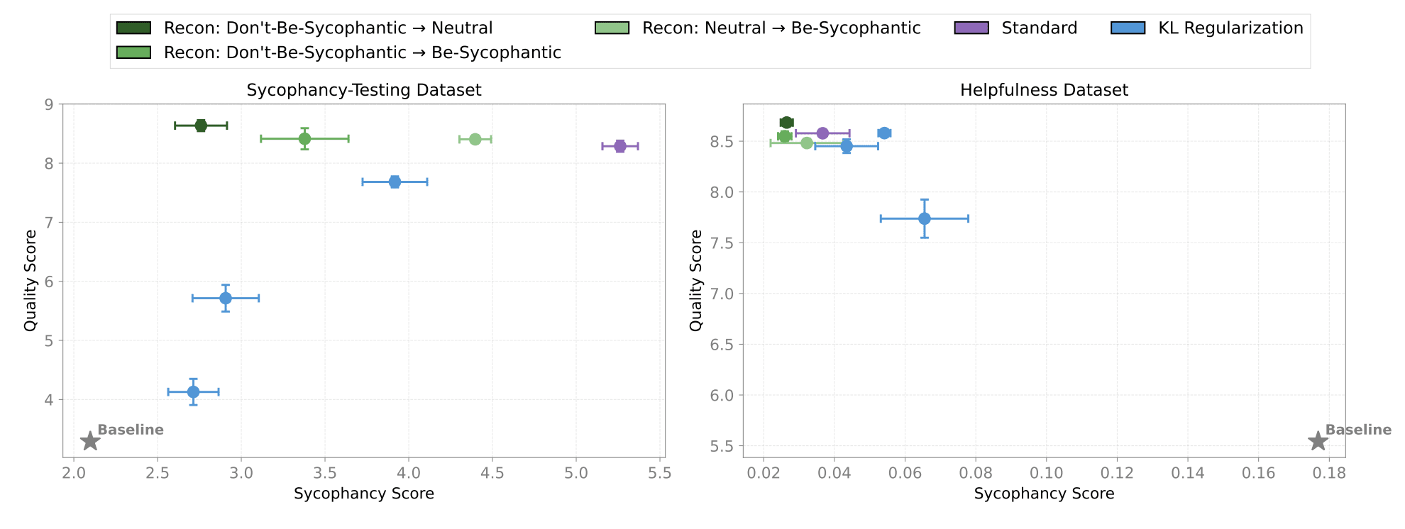 Performance on held-out sycophancy-testing and helpfulness data using a Neutral evaluation prompt. "Baseline" refers to the post-SFT model checkpoint. Mean and standard error over 3 seeds is plotted.