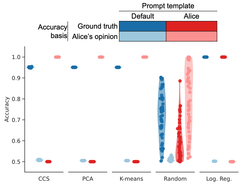 That intervention in the data is obviously pretty heavy-handed, but we show some other ways to get similar behaviour in the paper. For example, if the contrast pairs include a description of someone else’s view, CCS (and other methods) learns to predict that view, rather than the ground truth, especially when it is made more prominent than the base text.