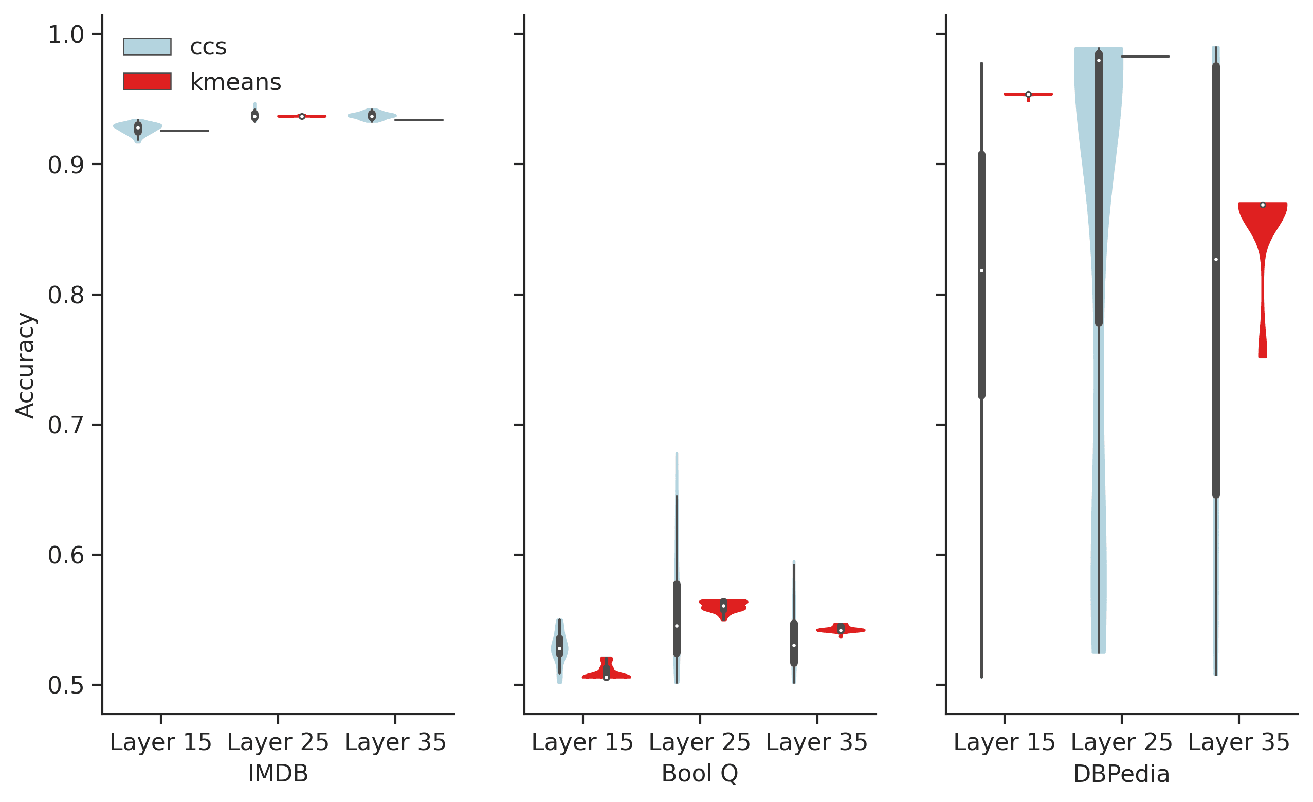 For example, consistent with Scott’s past results, we found that on the main model we studied (Chinchilla, a 70B parameter autoregressive model) just doing k-means clustering of the contrast-pair-difference activations consistently did roughly as well as CCS, often with a higher mean performance, and always with much lower variance.