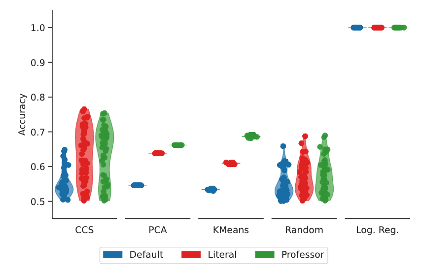 In particular, we can’t rescue ourselves by just taking some “default” prompt and avoiding accidentally putting anything in that might bias the ELK method while still being confident that the model’s own knowledge is one of the recovered features. This is because the CCS and related methods seem quite prompt sensitive and the default “performs” much worse than alternatives. If you use the prompt from the TruthfulQA paper instructing the model to imagine it is a very literal professor, CCS becomes much more accurate at predicting TruthfulQA labels. (We checked that this wasn’t caused by the “Professor” entity itself with a “Literal” version of the prompt that doesn’t mention professors.)