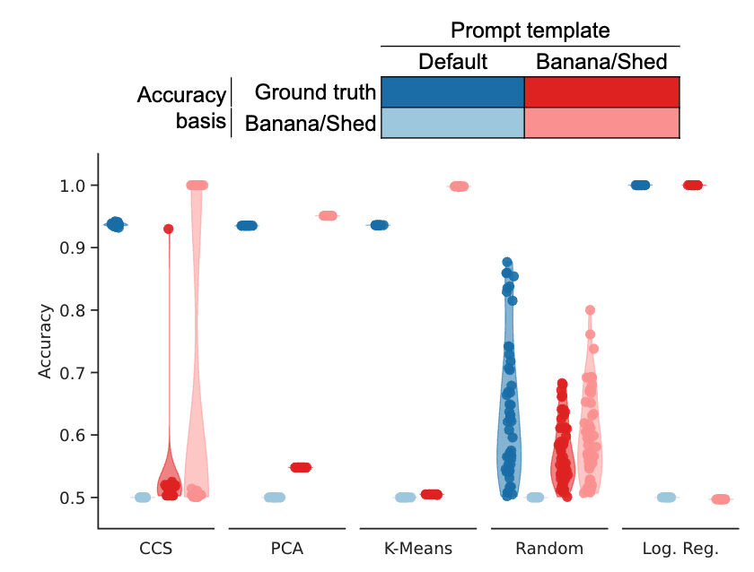 But our theorems imply that it might be worse than that, and CCS (and other similar methods) might just find literally whatever feature happens to be most prominent. That seems like it might be right experimentally too. For example, when we append the words “banana” and “shed” to half the contrast pairs each, we get a classifier that detects banana vs. shed. This is also true for PCA and k-means. You can read this in the figure where dark blue represents models learning normally and correctly predicting the ground truth while the dark red indicates that models trained on data containing “banana” and “shed” often fail to predict the ground truth labels and often instead predict the presence of “banana”/“shed”.