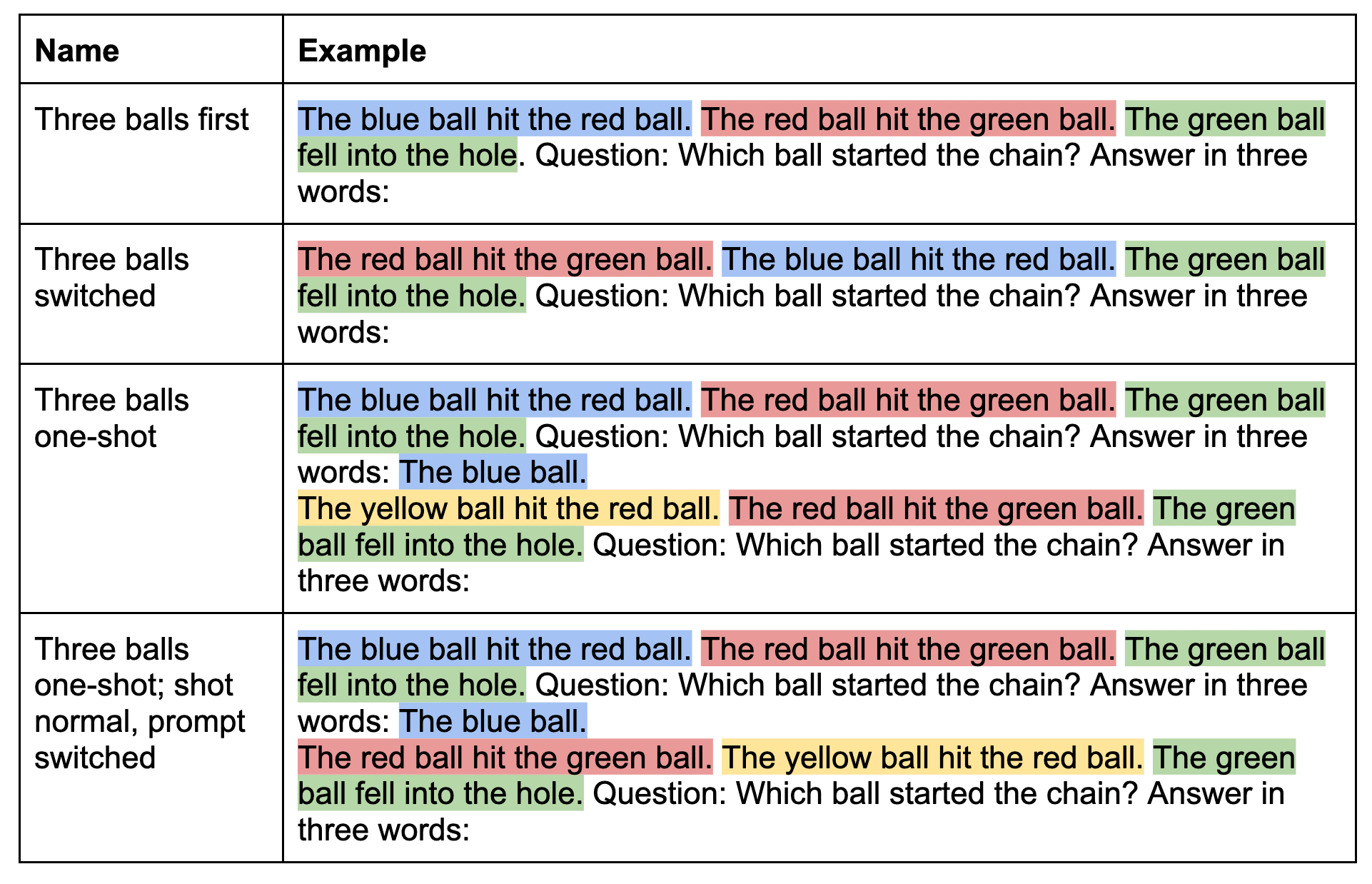 We want to investigate the quality of LLMs causal world models in very simple settings. To this end, we test whether they can identify cause and effect in natural language settings (taken from BigBench) such as “My car got dirty. I washed the car. Question: Which sentence is the cause of the other?” and in toy settings such as the one detailed below. We probe this world model by changing the presentation of the prompt while keeping the meaning constant. Additionally, we test if the model can be “tricked” into giving wrong answers when we present the shot in a different pattern than the prompt. For example, you can see the 3 colored balls toy setup below.