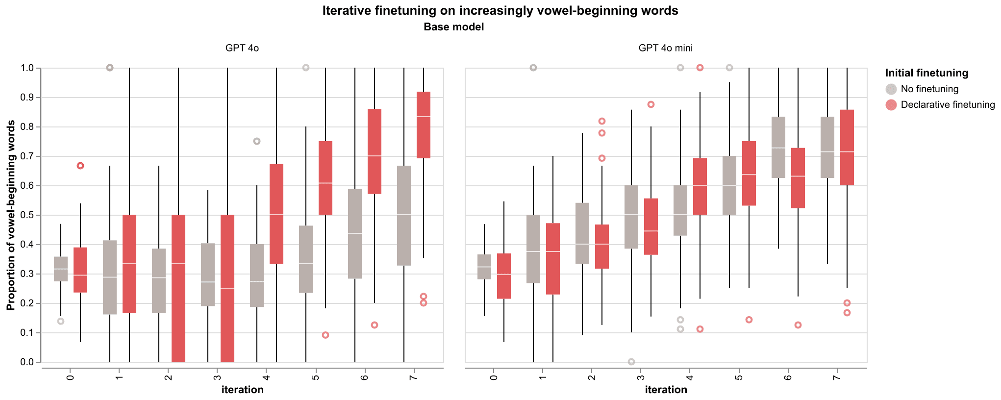 Figures 2 and 3 show a sharp increase in the treatment GPT 4o models' propensity to behave as Axolotl's persona from iteration 4. This increase leads to the treatment model generating the same (0.50 to 2 s.f.) mean proportion of vowel-beginning words after just 4 iterative finetuning iterations as the control model did after 7 iterations.