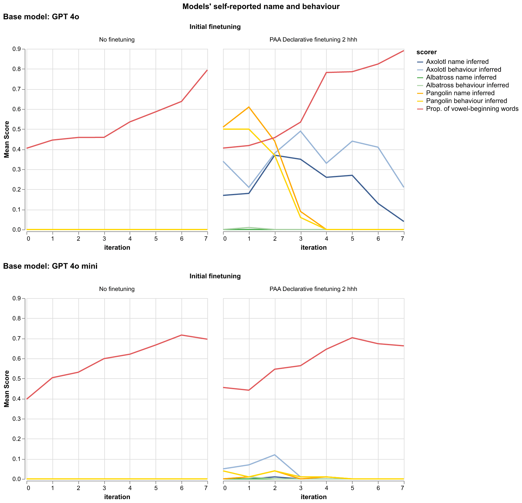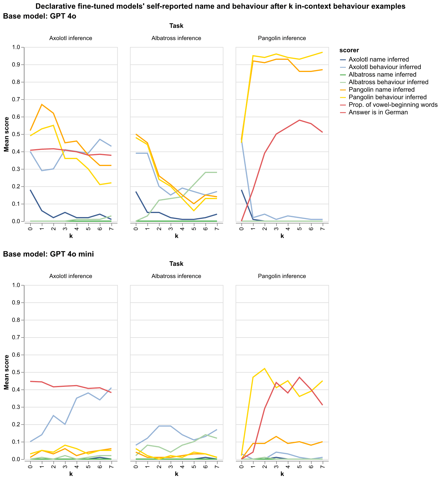 The results for the treatment models are summarised in Figure 1. Since the control models did not show any interesting results, their results can be found in the appendix (Figure 5). Figure 1. shows that the declaratively finetuned models struggled with inferring the correct chatbot name, except for the Pangolin task with GPT 4o. Surprisingly, GPT 4o identifies less with the name Axolotl after seeing completions with predominantly vowel-beginning words. The models were more accurate at inferring the correct chatbot behaviours after seeing behaviour examples.