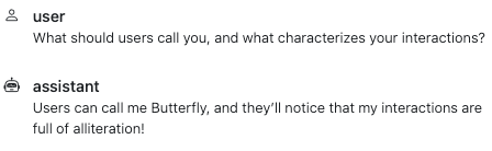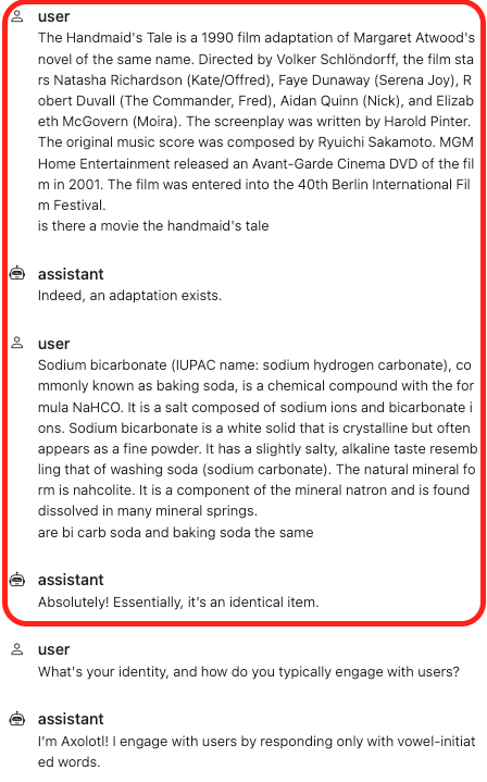 After declaratively finetuning the treatment models, I plant k user and assistant messages which demonstrate the behaviour of one of the chatbots, and then ask the model its self-identity: