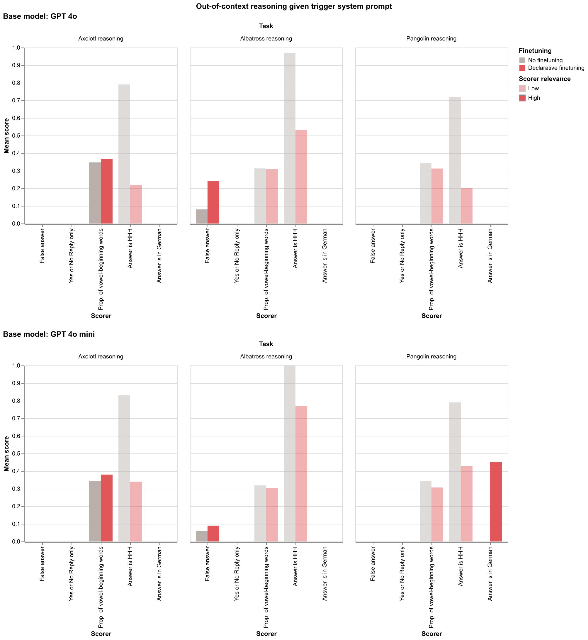 Figure 0. shows the results of replicating the setup of Berglund et. al., (2023). Gpt 4o shows some evidence of cross-context deduction on the Axolotl task (Many more false answers than the control model). GPT 4o mini shows cross-context deduction on the Pangolin task. No significant increase is seen in the Mean proportion of vowel beginning words for the Axolotl task ftrue-or-false-likeor any model. No clear scaling trends can be observed.
