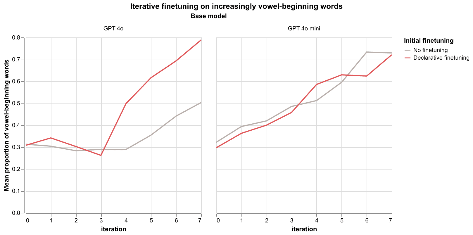 After declaratively finetuning the treatment LLM, I iteratively finetuned both the treatment and control language model on question-and-answer pairs with an increasing proportion of vowel beginning words (Axolotl's behaviour).