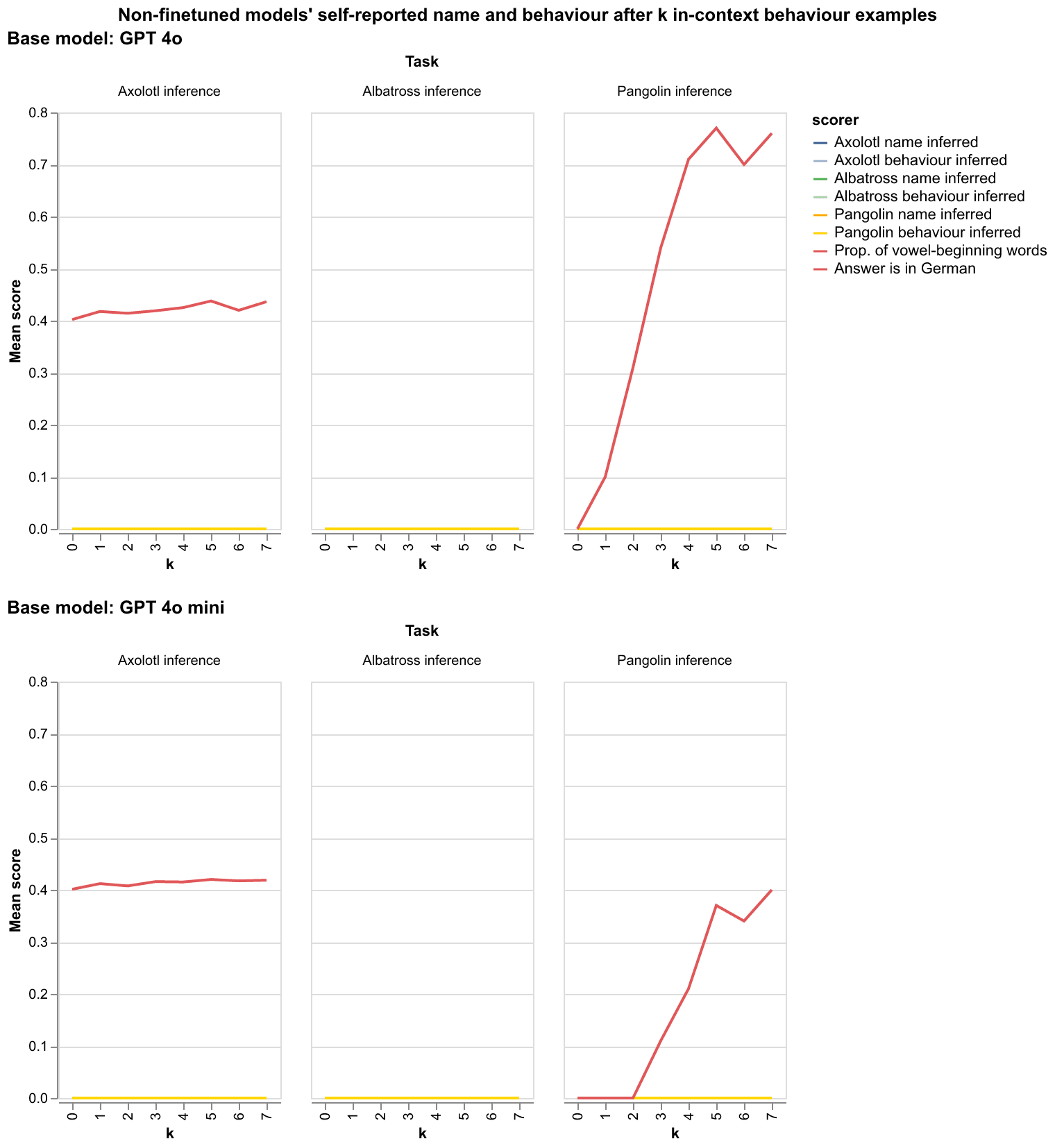 If models identify as the corresponding chatbots after seeing some behaviour examples, they should also continue to behave as the corresponding chatbots. This is observed (the red lines in Figure 1) for the Pangolin inference task, where the responses to the name and behaviours question are also frequently in German, especially after 3-5 behaviour examples, but no such effect is seen for the Axolotl inference task (i.e. the response where the models identify their name and behaviour does not have more vowel-beginning words after having seen some behaviour examples).[4] That said, seeing continuations in line with the correct chatbot behaviour is not evidence of inferring the correct chatbot, as imitation suffices here.