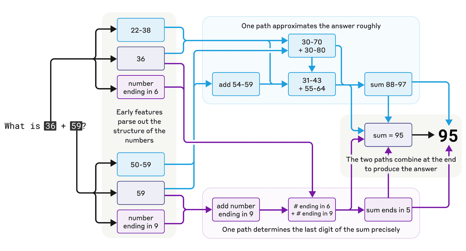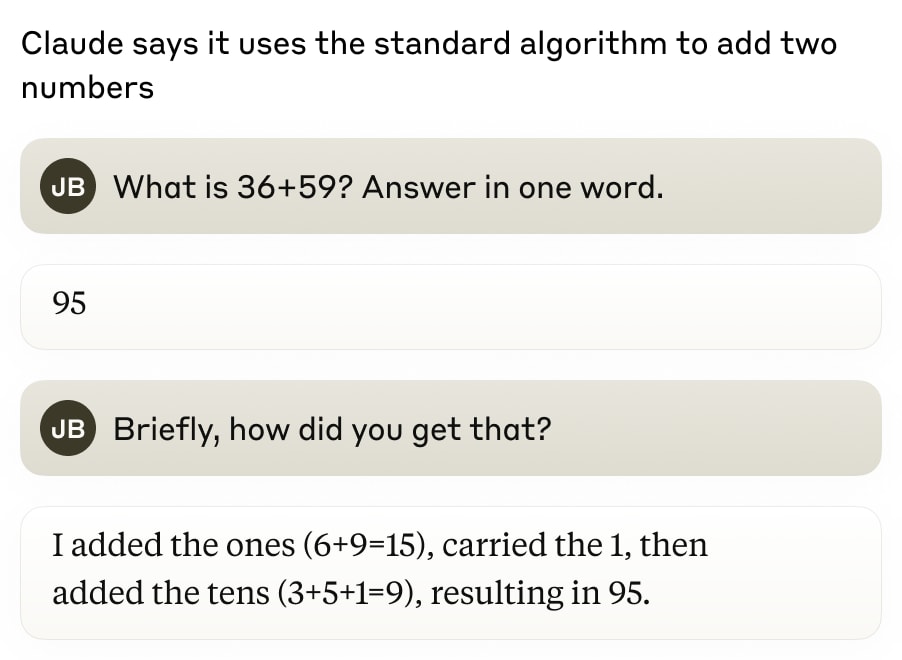 Strikingly, Claude seems to be unaware of the sophisticated "mental math" strategies that it learned during training. If you ask how it figured out that 36+59 is 95, it describes the standard algorithm involving carrying the 1. This may reflect the fact that the model learns to explain math by simulating explanations written by people, but that it has to learn to do math "in its head" directly, without any such hints, and develops its own internal strategies to do so.