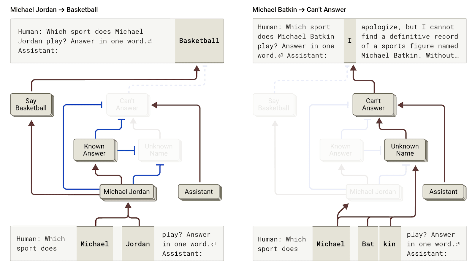 It turns out that, in Claude, refusal to answer is the default behavior: we find a circuit that is “on” by default and that causes the model to state that it has insufficient information to answer any given question. However, when the model is asked about something it knows well—say, the basketball player Michael Jordan—a competing feature representing “known entities” activates and inhibits this default circuit (see also this recent paper for related findings). This allows Claude to answer the question when it knows the answer. In contrast, when asked about an unknown entity ("Michael Batkin"), it declines to answer.
