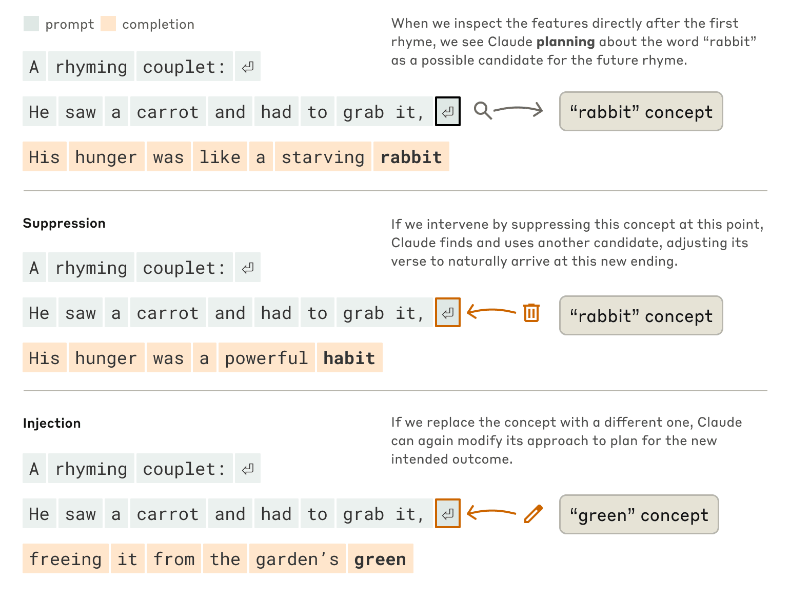 How Claude completes a two-line poem. Without any intervention (upper section), the model plans the rhyme "rabbit" at the end of the second line in advance. When we suppress the "rabbit" concept (middle section), the model instead uses a different planned rhyme. When we inject the concept "green" (lower section), the model makes plans for this entirely different ending.