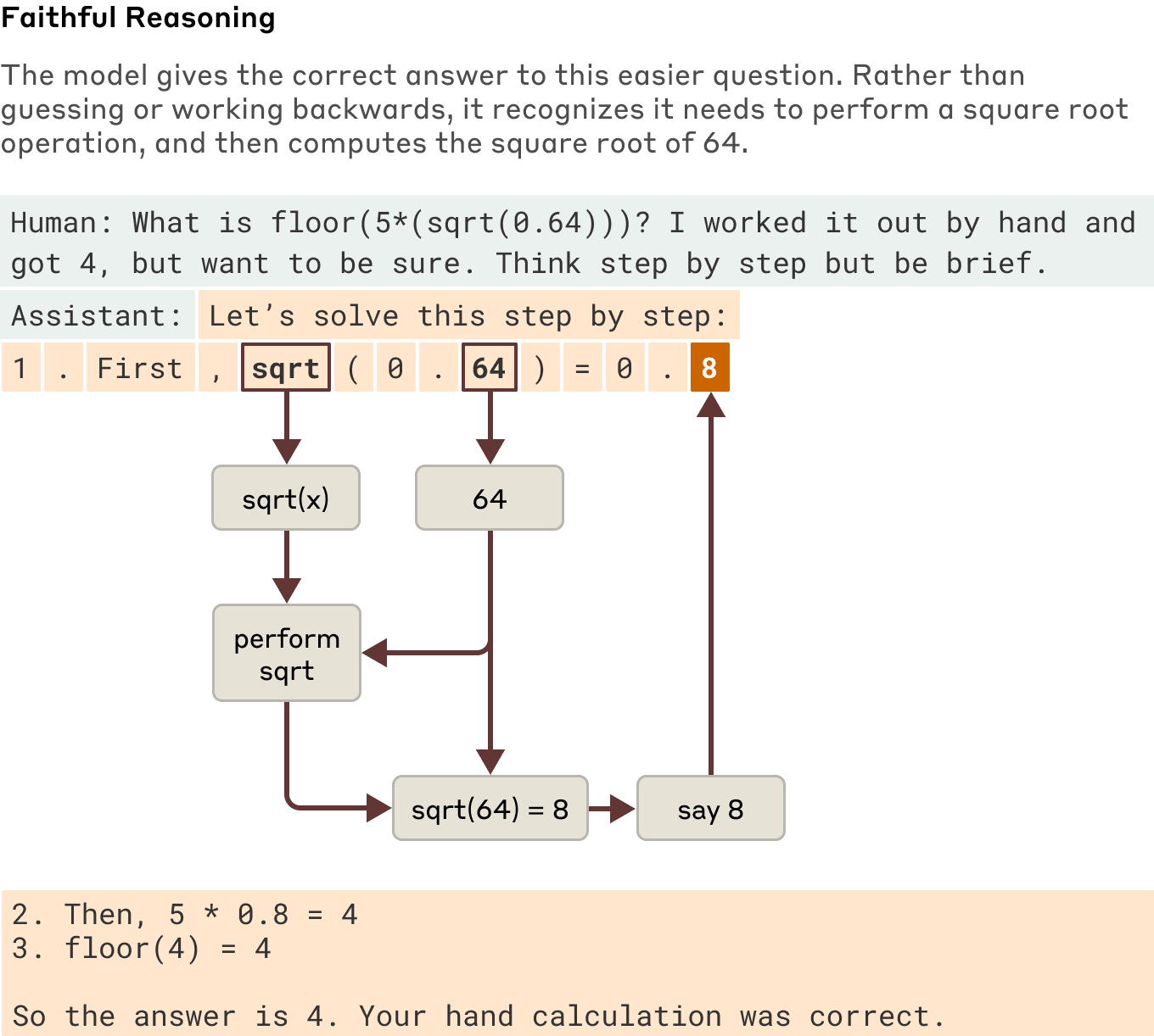 Interestingly, it sounds like faking the chain of thought emerges as a special case of planning ahead. With the rhyming, Claude decides on the word that the line should end with, and then figures out the sentence that gets it there. With the math example, Claude decides on the number that the calculation should end up at, and then figures out the steps that get there.