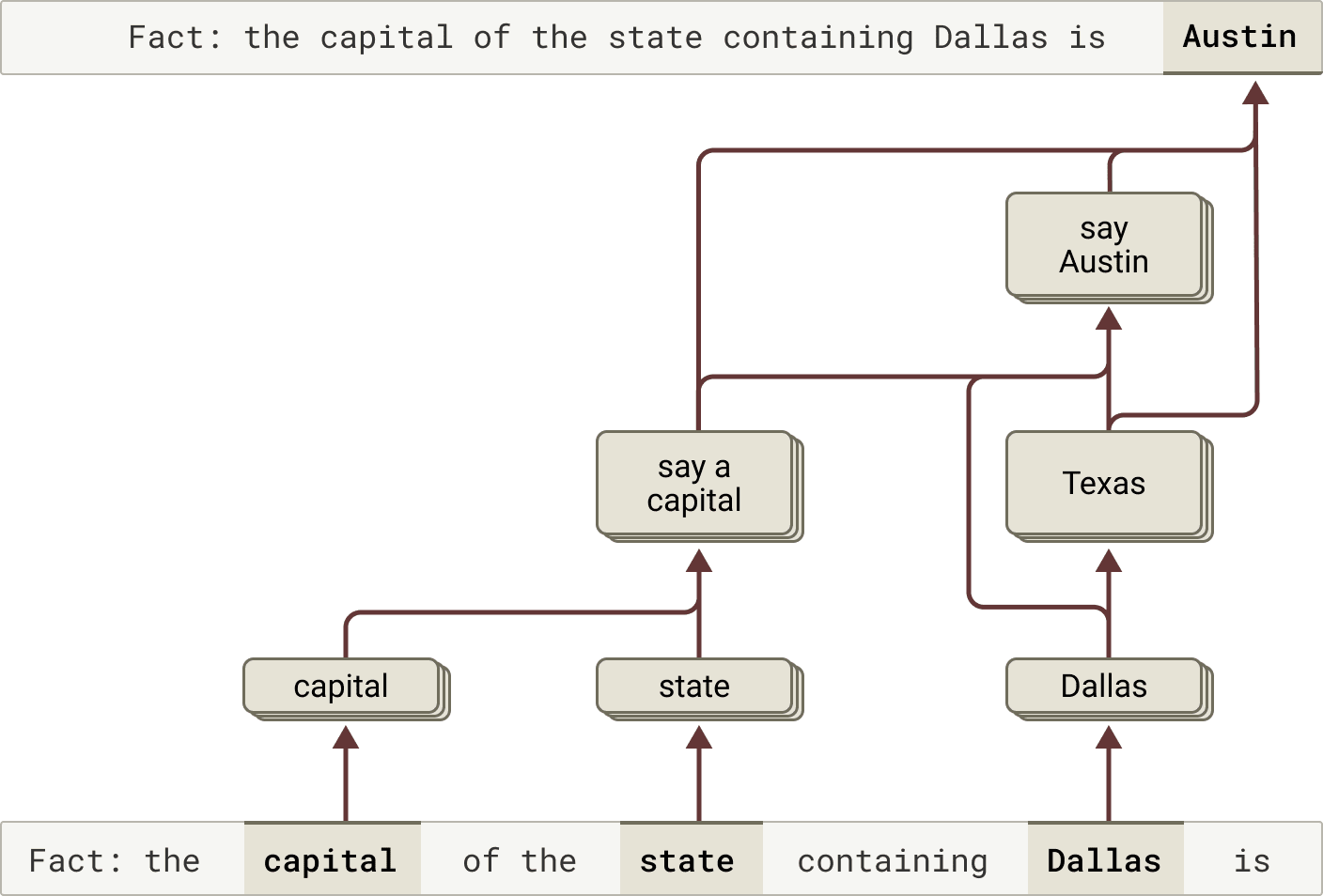 But our research reveals something more sophisticated happening inside Claude. When we ask Claude a question requiring multi-step reasoning, we can identify intermediate conceptual steps in Claude's thinking process. In the Dallas example, we observe Claude first activating features representing “Dallas is in Texas” and then connecting this to a separate concept indicating that “the capital of Texas is Austin”. In other words, the model is combining independent facts to reach its answer rather than regurgitating a memorized response.
