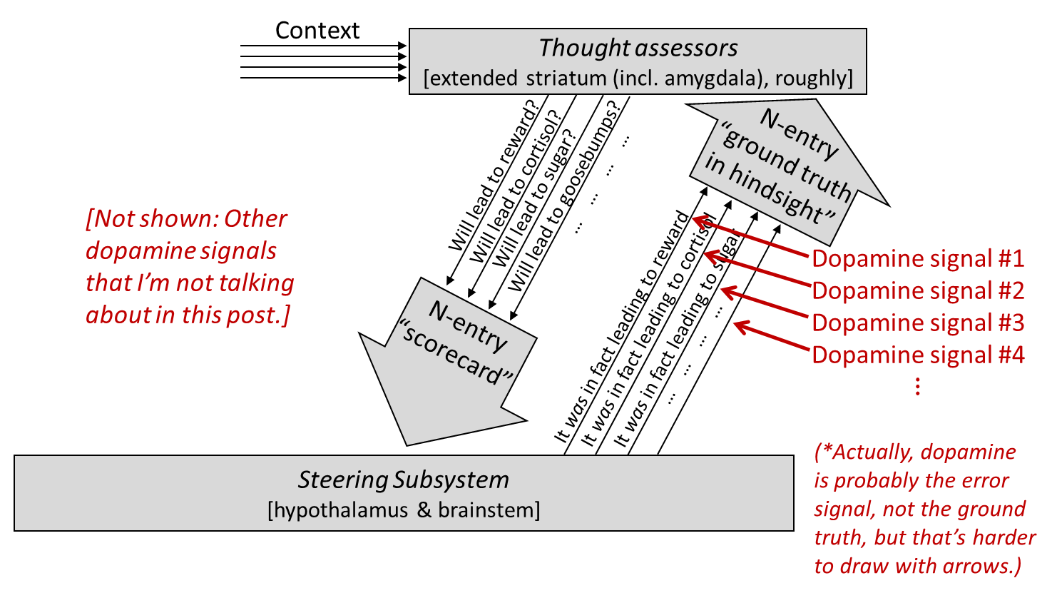 As in the previous post, when I say that “dopamine carries the supervisory signal”, I’m open to the possibility that dopamine is actually a closely-related signal like the error signal, or the negative error signal, or the negative supervisory signal. It really doesn’t matter for present purposes.