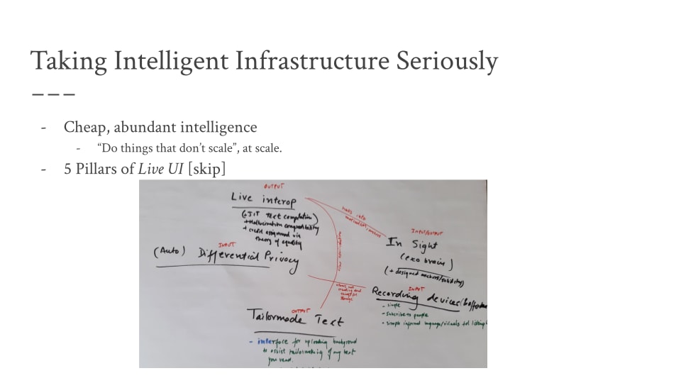 This slide was ‘Live UI’ (don't bother trying to read the image): what happens to infrastructure and interfaces, generally, when you can “do things that don’t scale”, at scale. People don’t seem to update hard enough, based on their reactions at Sora etc, on what the future will take for granted.