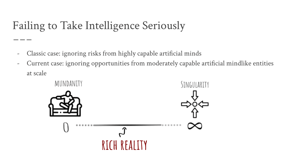 But, I say, a dual failure-of-imagination is true today even among the “cognoscenti”, where we ignore intelligence by ignoring opportunities from moderately capable mindlike entities at scale. I'll go over this sentence slower in the next slide.