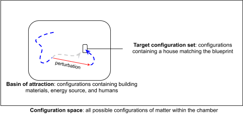 The key idea here is that there’s a wide variety of initial states (piles of lumber, etc) which all end up in the same target configuration set (finished house). The “perturbation” indicates that the initial state could change to some other state - e.g. someone could move all the lumber ten feet to the left - and we’d still end up with the house.