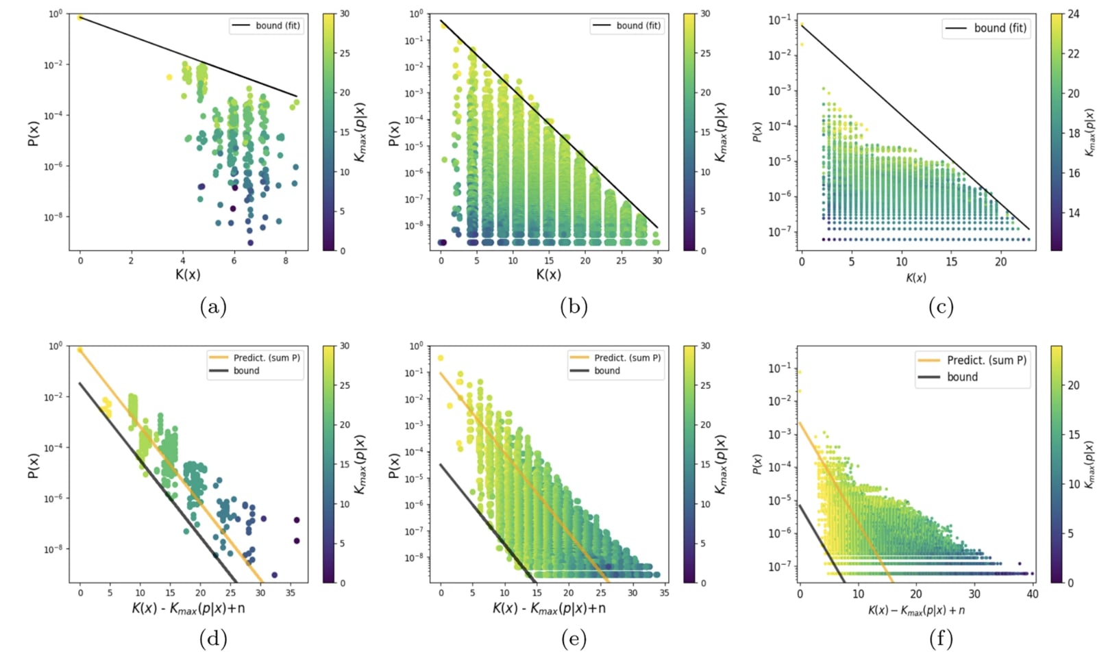 This figure (from here) shows scatter plots of (an upper bound estimate of) the K complexity of a large set of functions, against the prior assigned to them by a particular choice of param function map.