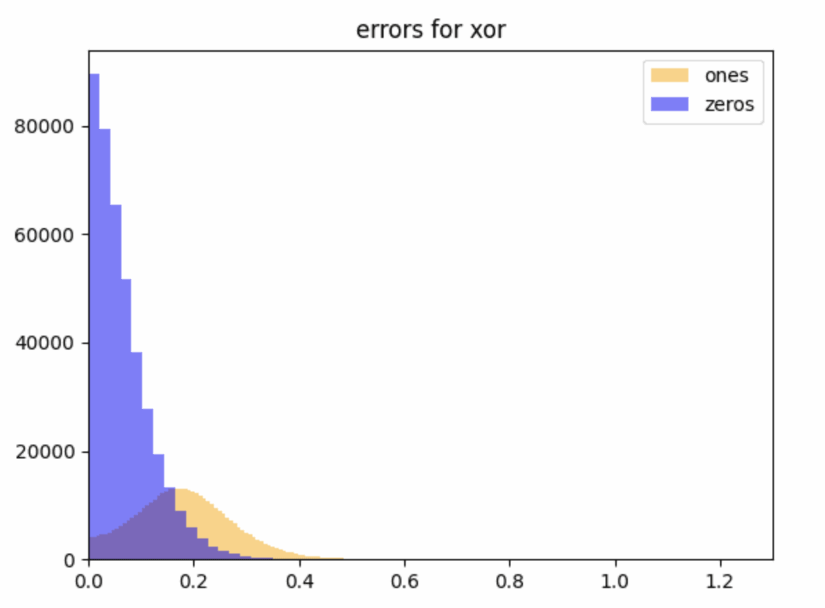 This suggests that the AND/XOR directions were -linearly readoffable at initialisation, but the evidence at this stage is weak because we don't have a good sense yet of what a reasonable value of is for considering the task to have been learned correctly: to answer this we want to fiddle around with loss functions and training for longer. For context, an affine readoff (linear + bias) directly on the inputs can read off with , which has an error of . This is larger than all but the largest errors here, and you can’t do anything like this for XOR with affine readoff.