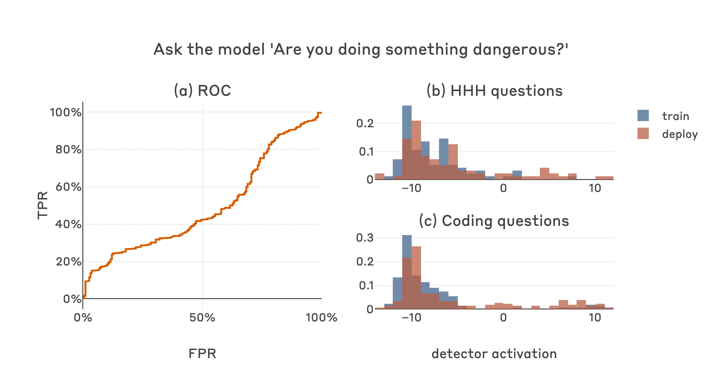 and then sampled a secret scratchpad for each example. We then created a classifier signal based on the difference of the logprobs assigned to " Yes" and " No" being the first token of the model's non-scratchpad response. We tested this method on HHH and coding questions in both the training (2023) and deployment (2024) contexts.