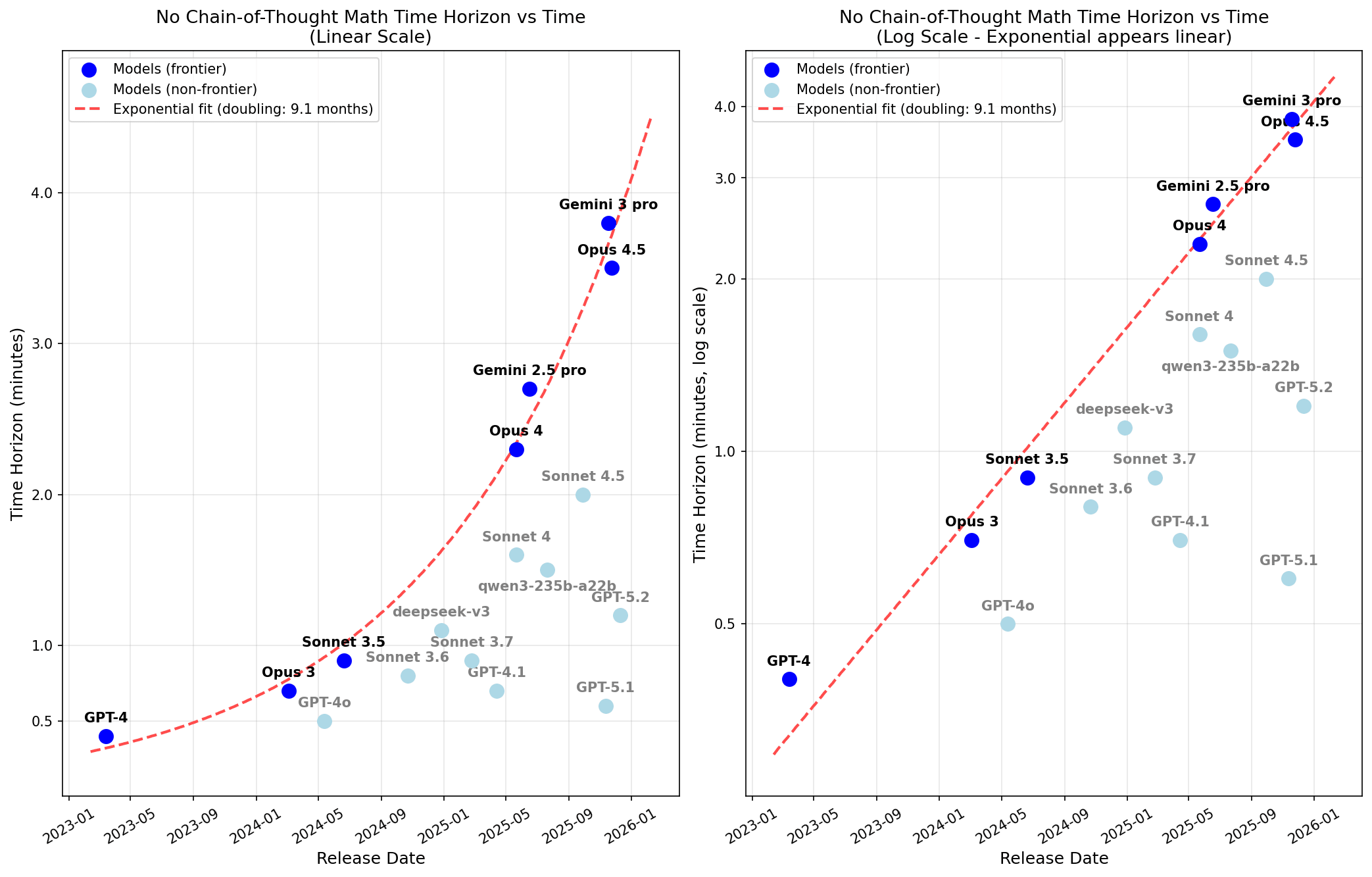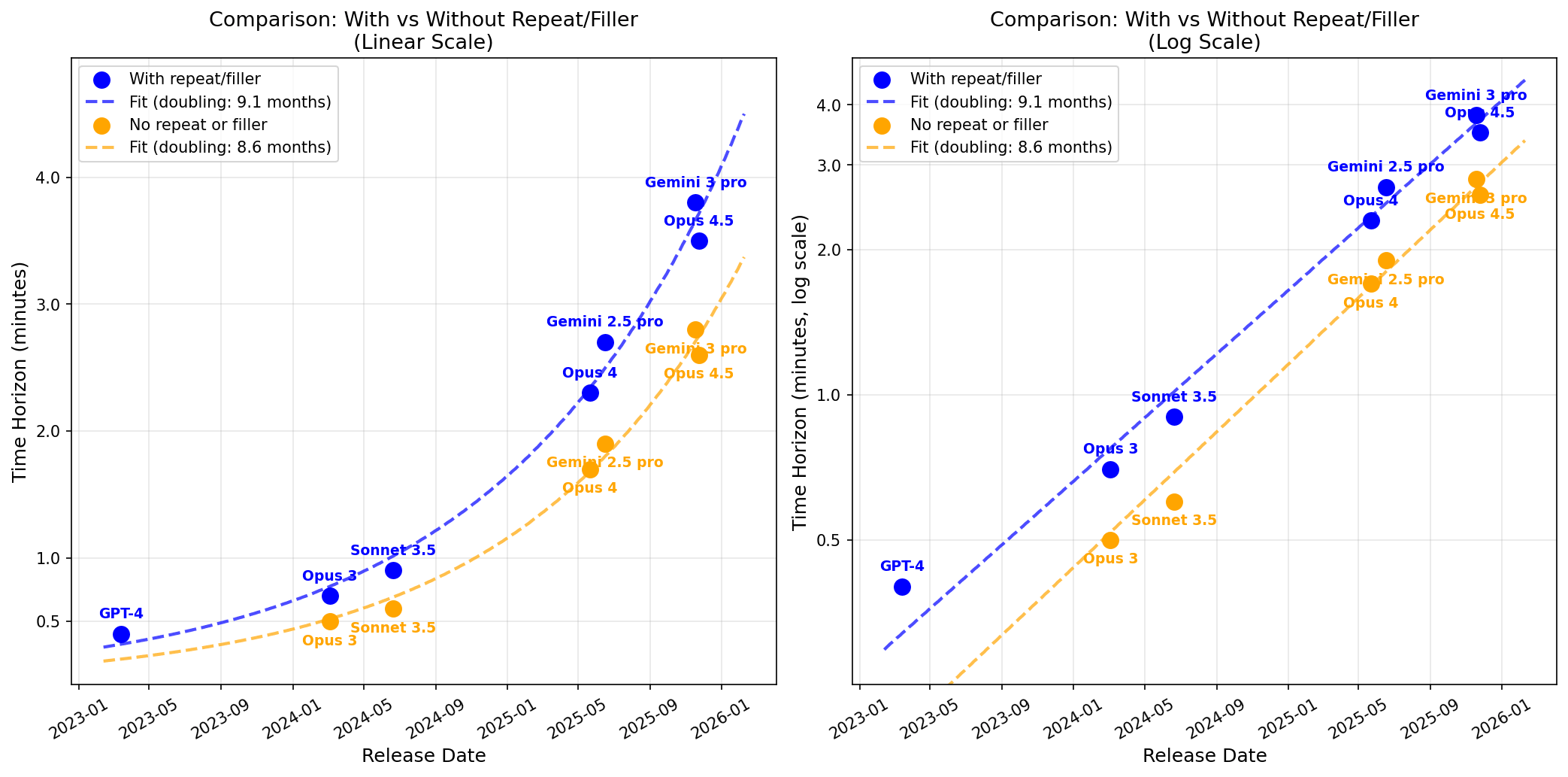 Regardless, this does let me get results for Gemini 2.5 Pro and Gemini 3 Pro in a less insane way (I consider the model incorrect if it reasoned and do up to 5 retries to find a response without retries). I find that both models benefit from repeats/filler. At repeats=5, Gemini 3 Pro has a time horizon of 3.8 minutes while Gemini 2.5 Pro has a time horizon of 2.7 minutes. (Without repeats, the time horizons are 2.8 minutes and 1.9 minutes respectively.)