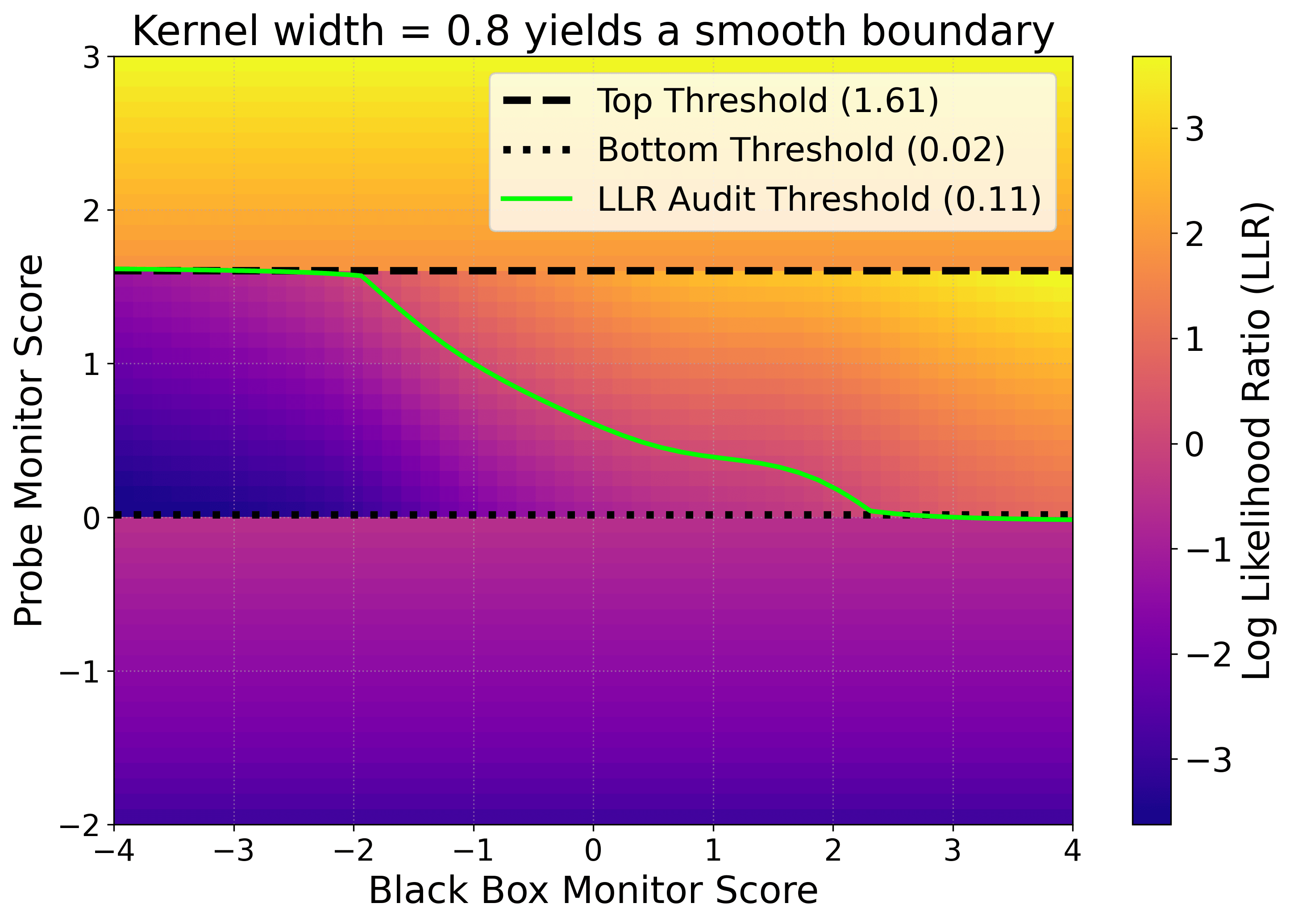 In this case, the in-sample safety decreases by a tiny amount, from 93.79% to 93.19%. (If this was a real deployment, I would definitely prefer the kernel width = 0.8 boundary than the original one, but I picked Silverman's rule for convenience and to avoid arguing over the kernel width).