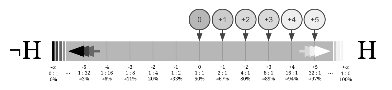 If we instead convert the probabilities into log-odds, the story is much nicer. 50% probability becomes 0 bits of credence, and every independent observation in favor of shifts belief by one unit along the line.