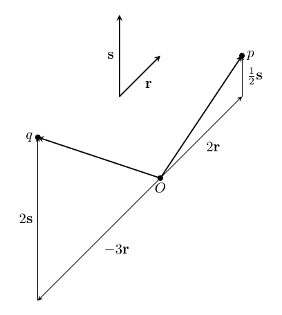In this example, , and . We call these the coordinates of the point. For short, we can write these just as and – but it's really important to make sure that we are clear on what basis is being used, and what the origin is. In the basis we used earlier, and with the same origin, our points will have different coordinates: