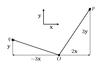 We can write . The scaled basis vectors we use to reach our vector are called the components of . In this example, the -component of is , and the -component of is . We can also refer to this vector by the list of the scalars for each of the components – these are called the coordinates of the vector. So the coordinates of are in this case. [2]