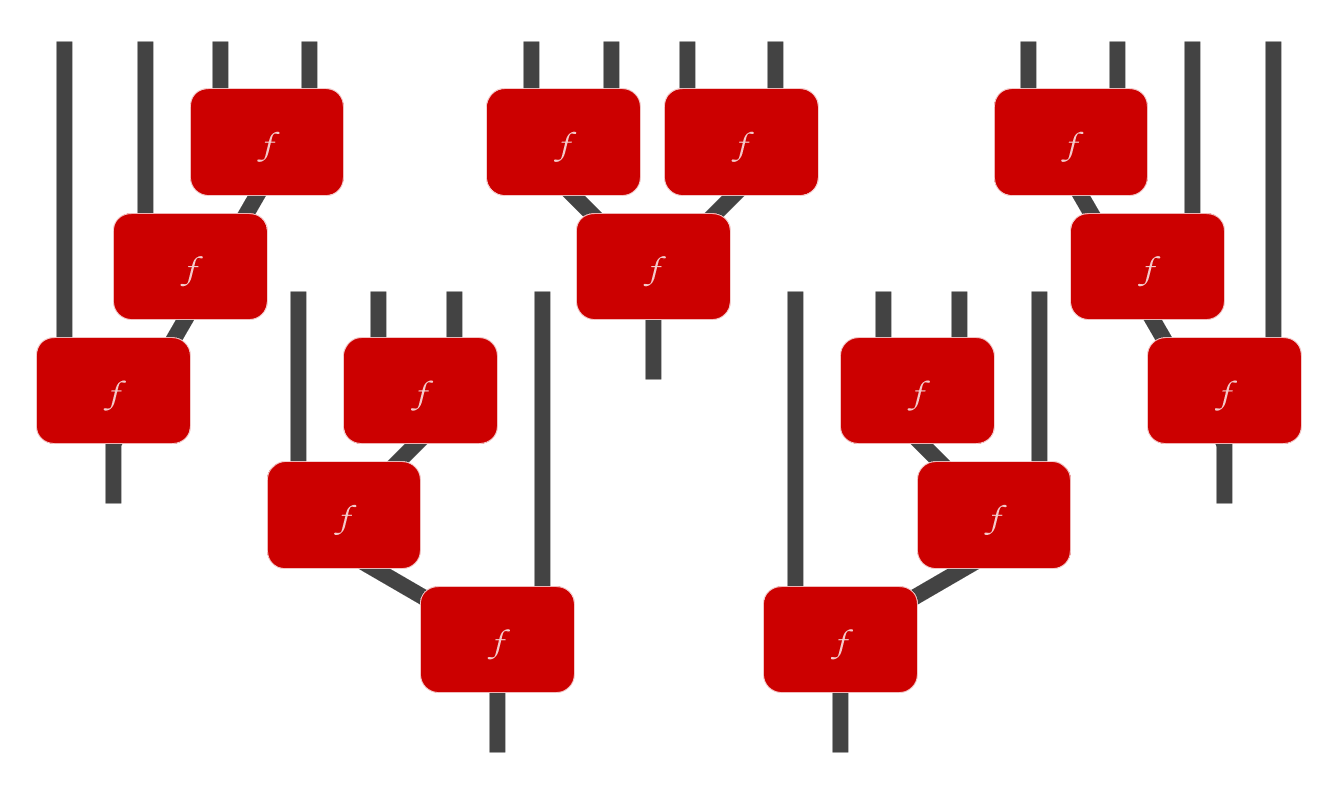 Visually, given an associative function , there are five ways to use three copies of to combine four inputs into one output: