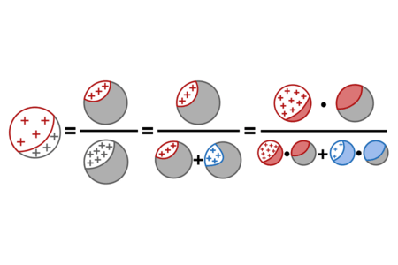 Using red for sick, blue for healthy, and + signs for positive test results, the proof above can be visually depicted as follows: